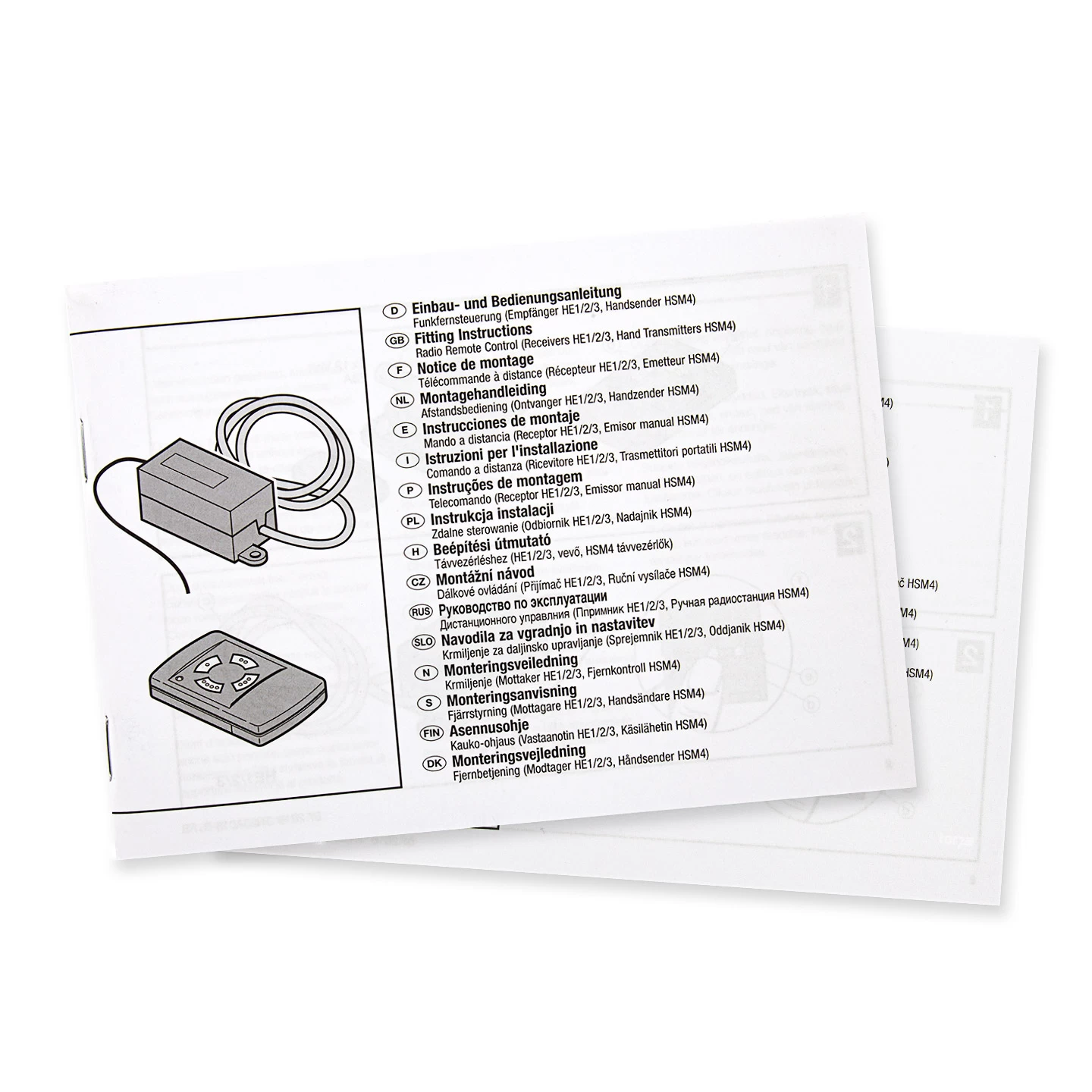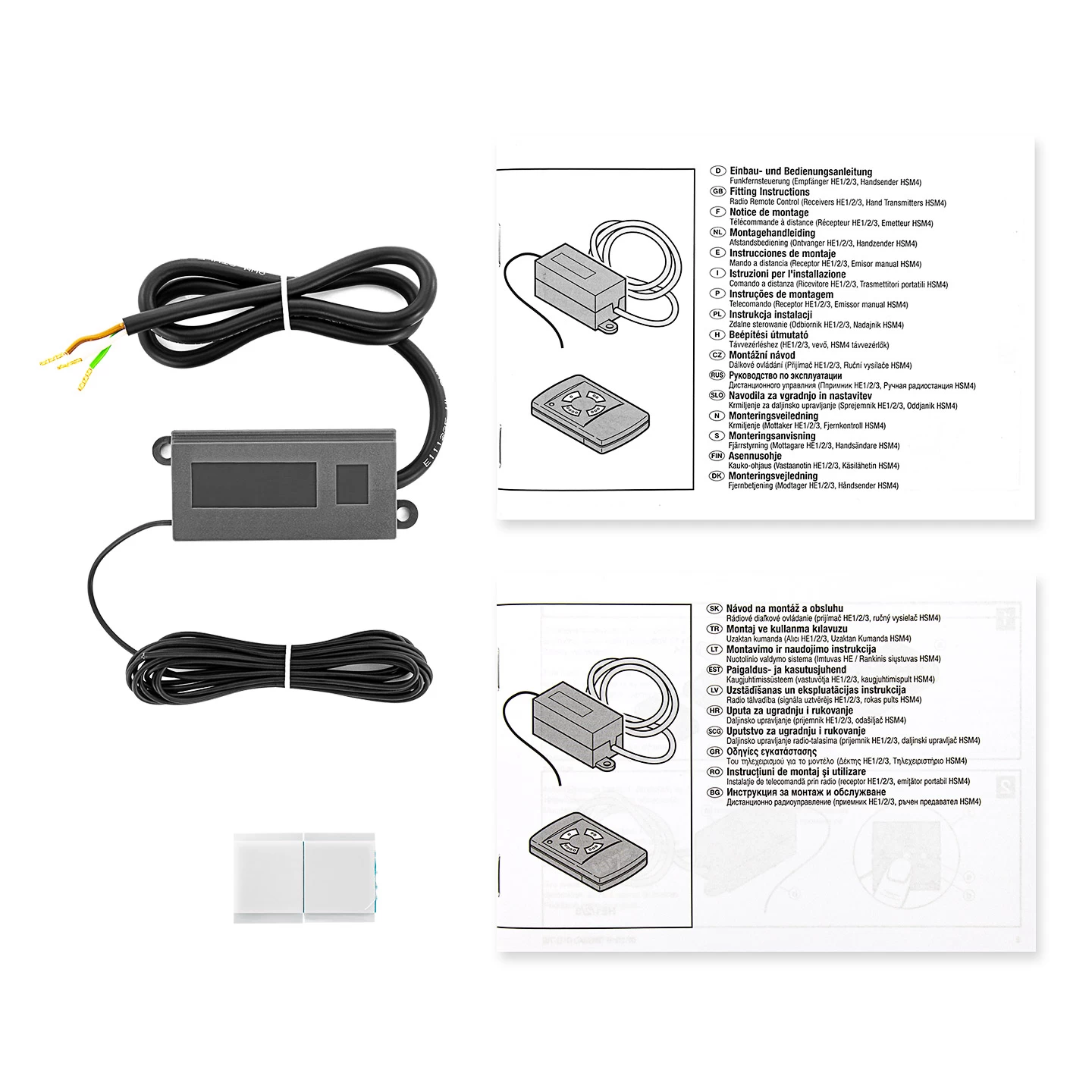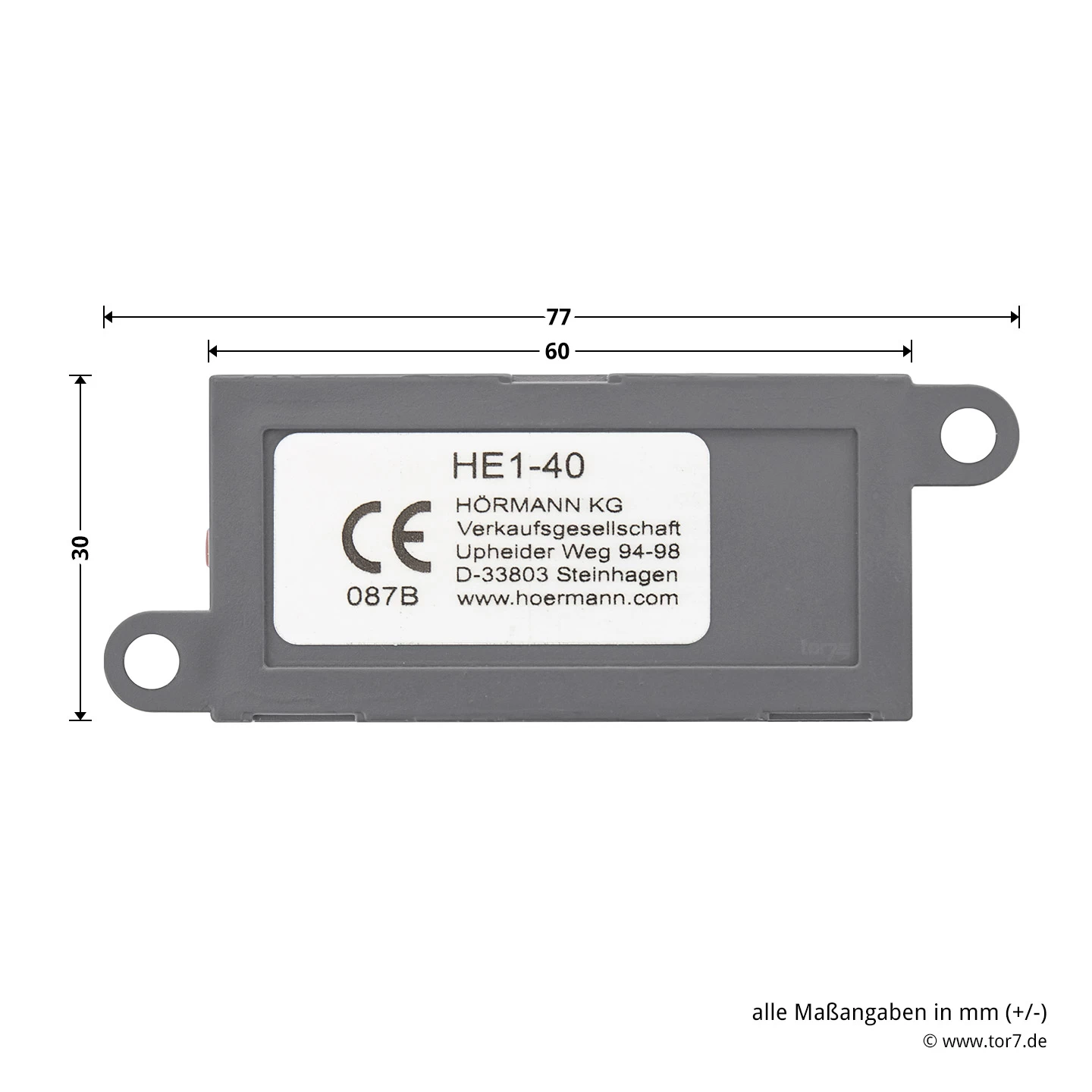 Allgemein ist sein Gebrauch bei sämtlichen Torantrieben ohne Ausnahme nur in trockenen Räumen erlaubt. Der Hörmann 1-Kanal-Empfänger HE 1 der Frequenz 40,685 MHz steckt in einem gesonderten Gehäuse aus Kunststoff, das mit einem steckbaren 3-adrigen Anschlusskabel von 50 Zentimeter Länge versehen ist. Die Betriebsspannung beträgt 24 Volt Gleichstrom (24 V DC). Der Funktionsimpuls von 0,5 Sekunden bewirkt das Öffnen und Schließen des Tores mittels eines elektrischen Toröffners.