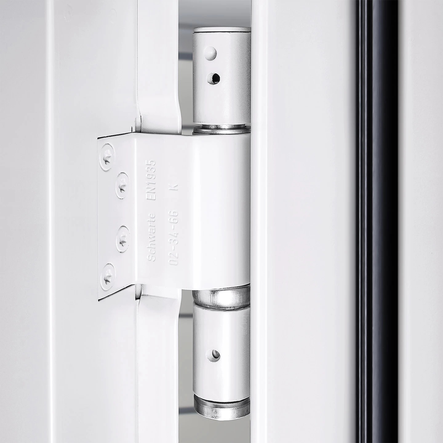 Die Hörmann Feuerschutztür H3-1 OD mit der Feuerwiderstandsklasse T30 ist eine hochwertige und robuste Stahltür mit einem 65 mm starkem Türblatt, die im Innenbereich in Wandaufbauten aus Mauerwerk (mind. 115 mm), Beton (mind. 100 mm) oder Porenbeton (mind. 150 mm) zulassungskonform montiert werden kann. Die Universal-Eckzarge wird bequem mit Diagonalbefestigung montiert und ermöglicht so einen geringeren Montageaufwand im Vergleich zur herkömmlichen Ankerlaschenbefestigung. Eine vollflächig verklebte Verbundkonstruktion im Türblatt und der Falz ermöglicht eine besonders hohe Stabilität und Flügelsteifigkeit. Für eine ausreichende Grundsicherheit sorgen das eingebaute, PZ-gelochte Einsteckschloss, welches bauseits mit einem Profilzylinder ausgestattet werden kann und die Stahl-Sicherungsbolzen auf der Bandseite. Im Lieferumfang ist neben der Hörmann Feuerschutz-Drückergarnitur, Kunststoff schwarz, U-Form, auch die passende Feuerschutzdichtung für OD-Stahltüren enthalten.