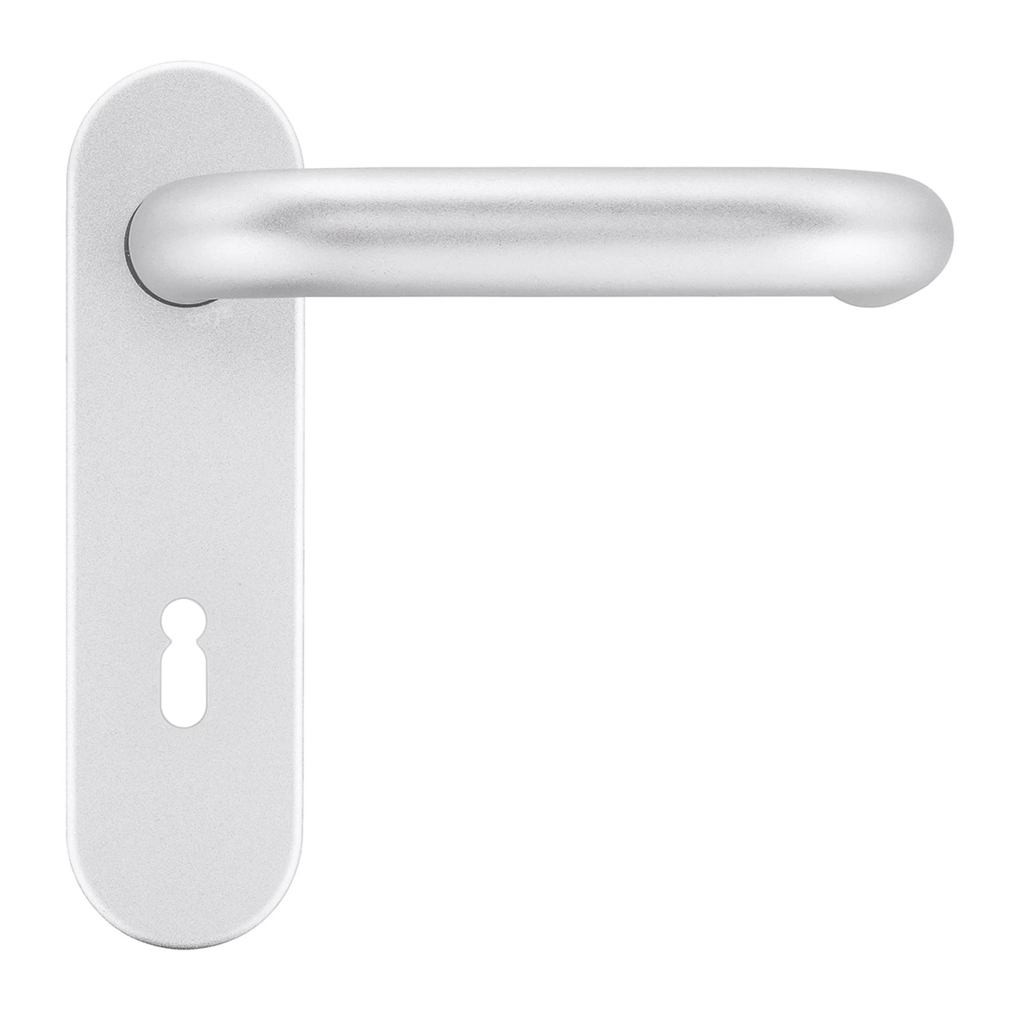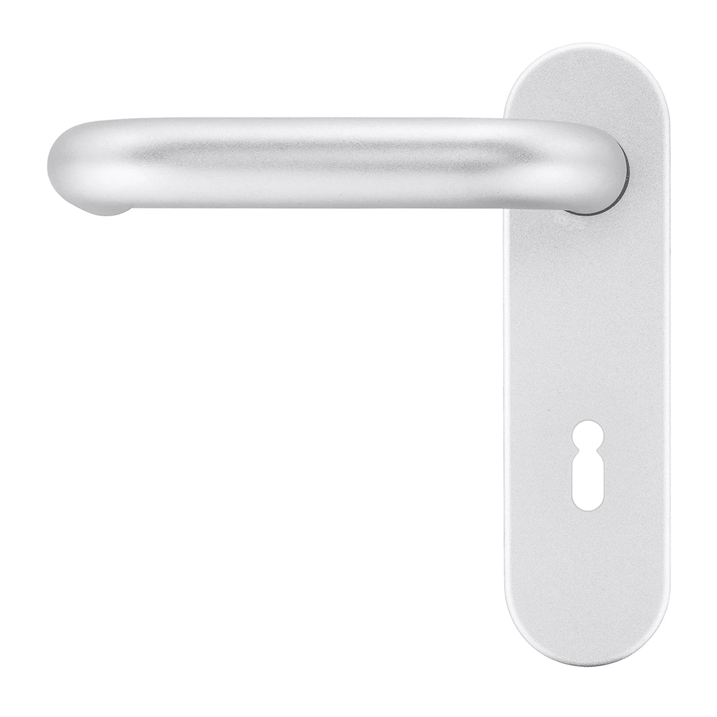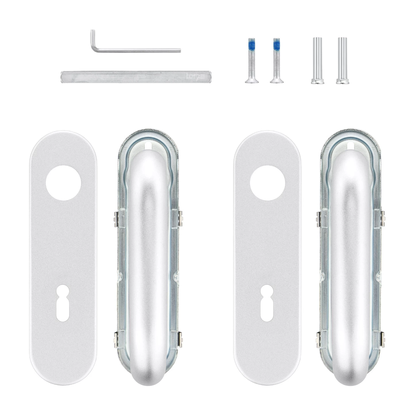 Die Hörmann Drückergarnitur vom Typ D110 mit Kurzschild und Buntbart-Lochung ist aus widerstandsfähigem Aluminium gefertigt und eignet sich für Hörmann Innentüren der Ausführung ZK oder OIT. Auch an Fremdfabrikaten mit Kurzschild kann diese Garnitur als Ersatz problemlos montiert werden. Sämtliches Montagematerial, eine Bohrschablone sowie ein 8 mm Vierkantstift sind im Lieferumfang enthalten und ermöglichen den sofortigen Austausch. Zu beachten ist hierbei, dass die BB-Lochung nur die Bedienung mit einem Buntbartschlüssel erlaubt. Die Nutzung mit Profilzylinder ist nicht möglich. Hierfür ist die entsprechende Garnitur mit PZ-Lochung auszuwählen.