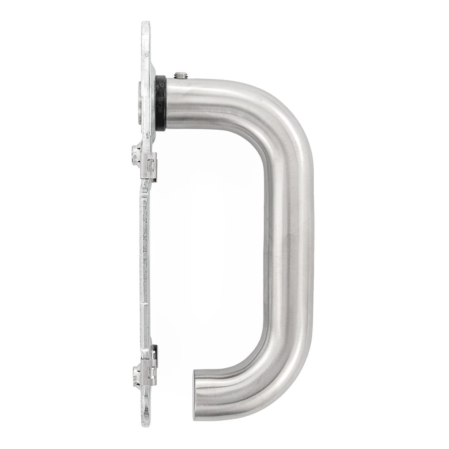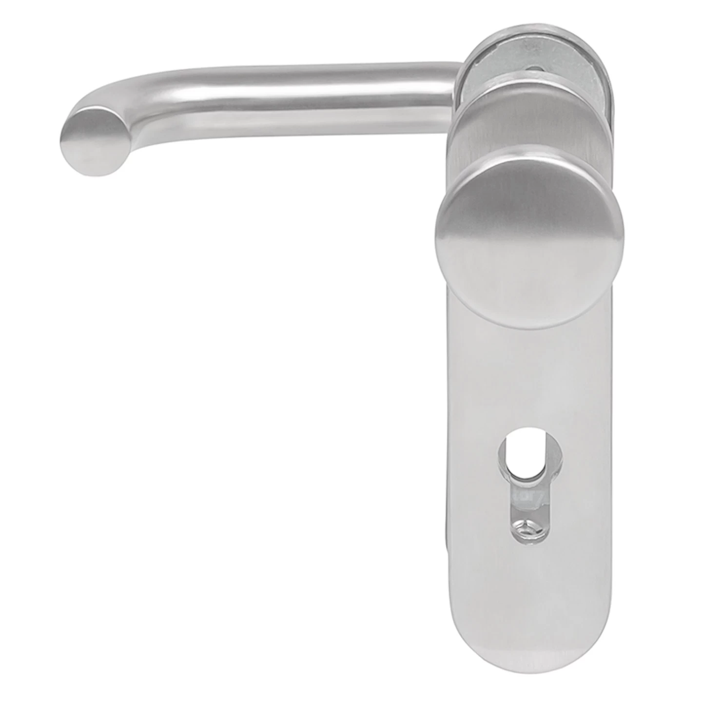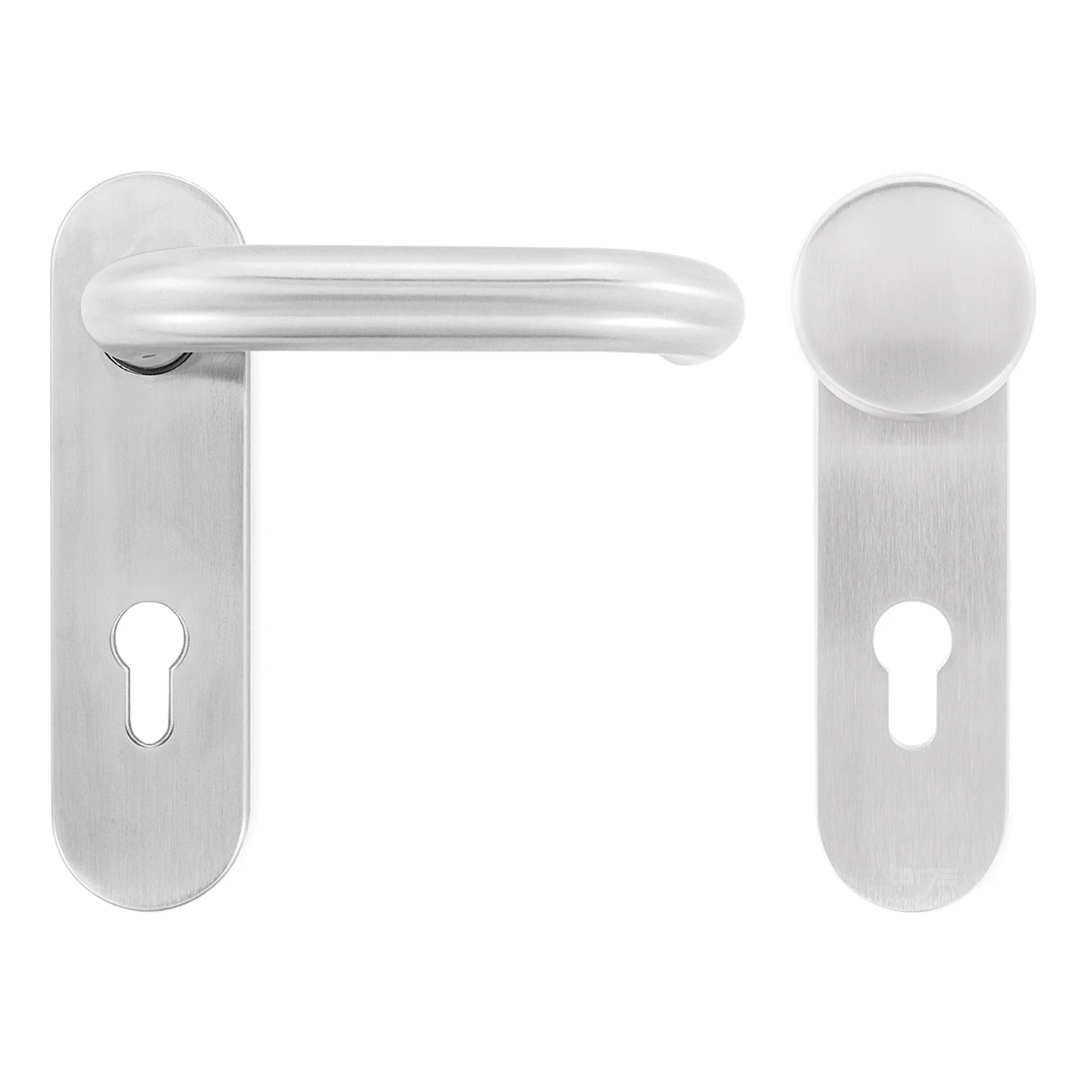 Drücker, Außengriff und Kurzschild sind aus hochwertigem, gebürstetem Edelstahl gefertigt und sorgen auch bei hohem Nutzungsaufkommen für eine lange Lebensdauer. Der Drücker wird in U-Form und der Außengriff in der runden Ausführung Knopf K-130 geliefert. Im Lieferumfang sind die Grundplatten aus Stahl und das Montagezubehör bereits enthalten.