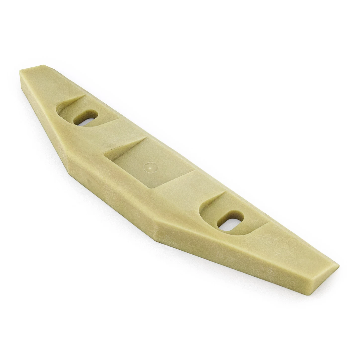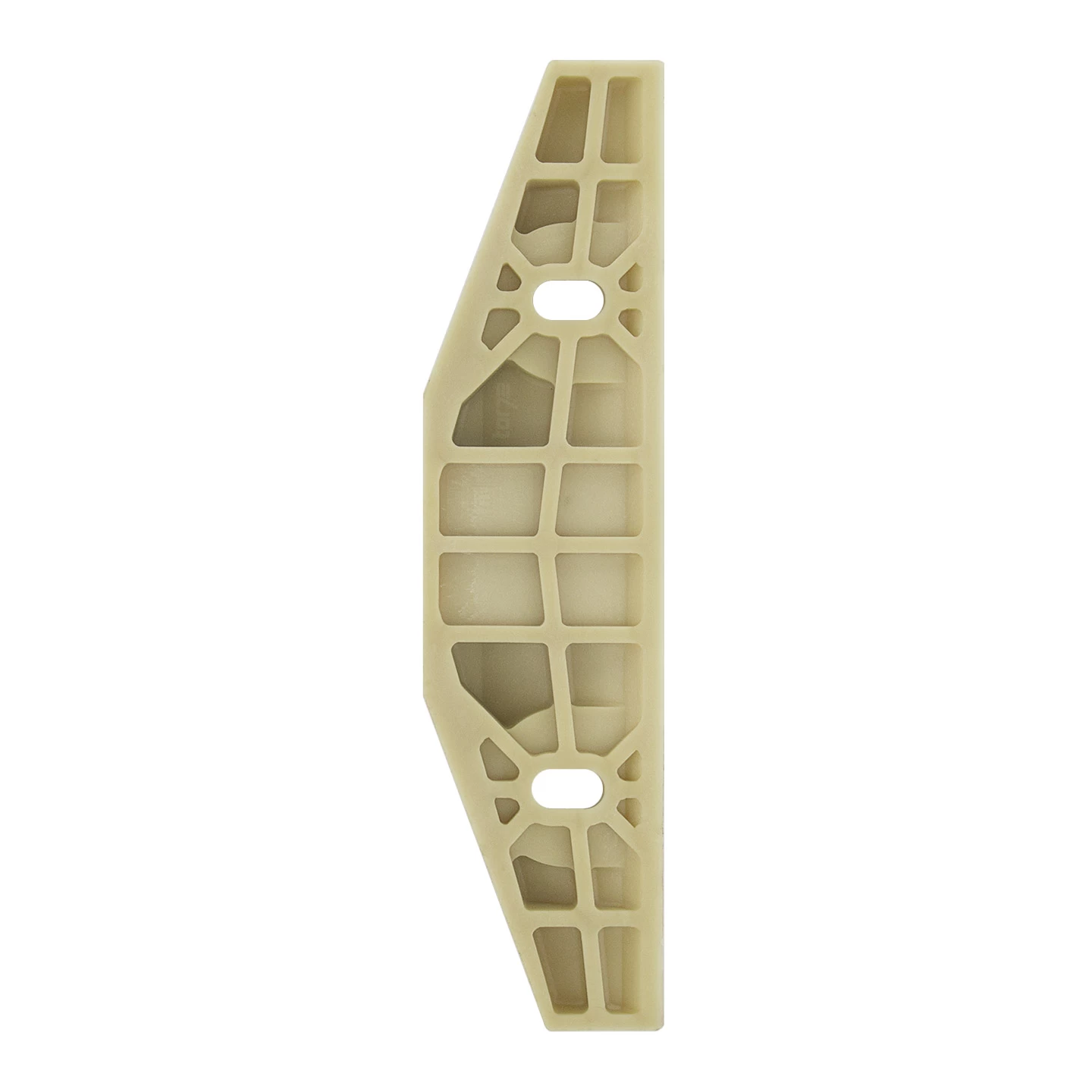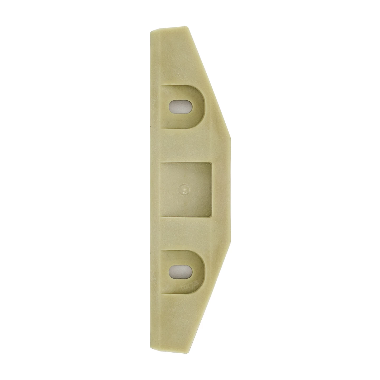 Das Führungsstück hat eine Breite von 90 mm und ist aus dem stabilen Kunststoff Polyamid gefertigt, so dass es die Belastungen durch das wiederholte Anschlagen des Torflügels aushält. Es sind zwei Befestigungspunkte mit Schraublöchern vorhanden, mit welchen das Teil am Boden befestigt werden kann. Weiterhin wird beim Hörmann mittleres Einlaufführungsstück, ohne Anschlag nicht nach der Torseite unterschieden, so dass das Teil beidseitig, also links und rechts, verwendbar ist.