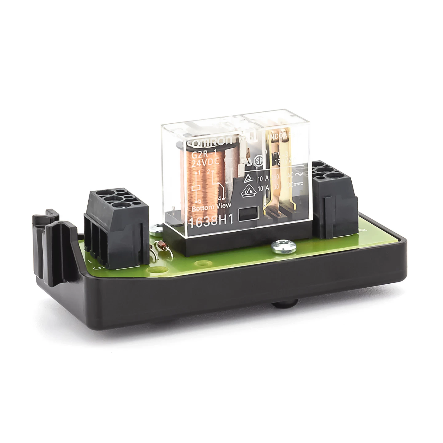 Die Hörmann Relaisplatine PR 1 mit Halterung dient als Zubehörteil für den Hörmann Türantrieb PortaMatic silber 868-BS und Hörmann Türantrieb PortaMatic weiß 868-BS. Das programmierbare Relais wird direkt im PortaMatic-Antrieb eingebaut und ist mit einem potentialfreiem Wechsler-Kontakt ausgestattet. Auf diese Weise können Sie externe Stromverbraucher mit einer maximalen Schaltleistung von 30 V DC, 2,5 A (ohmsche Last) / 250 V AC / 500 W (ohmsche Last) schalten. Hierzu wird das Optionsrelais einfach über die Klemmen 0 und 24 V direkt am Antrieb angeschlossen. Danach können beispielsweise Lampen angeklemmt und über den Antrieb programmiert werden. Beachten Sie, dass die externen Verbraucher mit einem eigenen Stromanschluss ausgestattet sein müssen, da das Relais den Stromkreis nur schaltet.