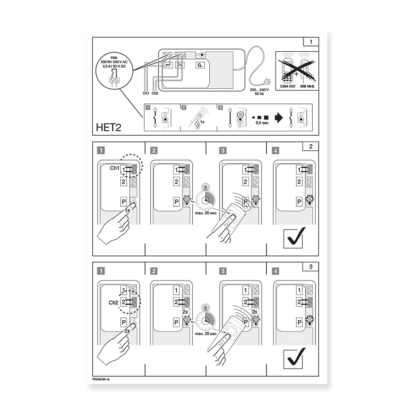 Mit dem Hörmann Set aus einem Hörmann 2-Kanal-Relais-Empfänger HET 2, 868 MHz und den beiden Hörmann Handsender HSE 2, 868 MHz lassen sich bis zu zwei bereits vorhandene Antriebe preiswert auf den Hörmann-Funkstandard 868 MHz Festcode umrüsten. Das Empfängergerät befindet sich in einem separaten Kunststoffgehäuse mit einer einen Meter langen Anschlussleitung mit Eurostecker. Das Empfänger-Handsender-Set eignet sich für Torantriebe des Unternehmens Hörmann und für Fremdfabrikate.