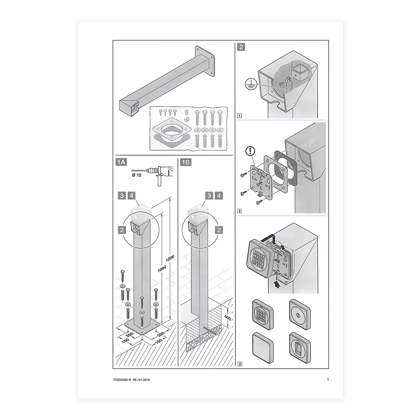 Sie haben bei der Bestellung der Standsäule STN 1-1 die Auswahl zwischen zwei Varianten: 1.) Standardversion STN 1-1 (Art-Nr. 638977) mit Schraubsockel zur Montage auf festen Untergrund, 2.) Variante STN 1-1 B (Art-Nr. 638978) ohne Schraubfuß zum Einbetonieren.