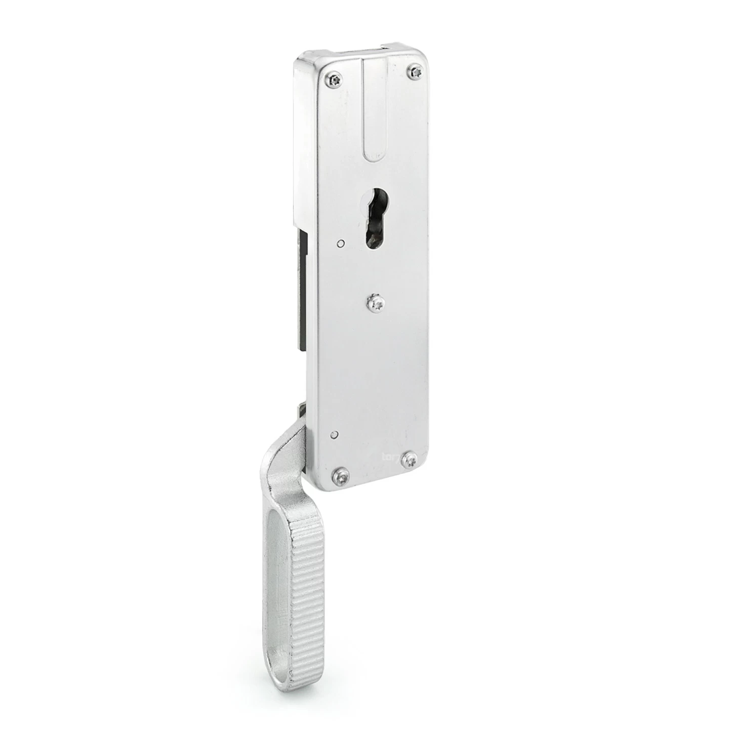 Von dem Baskülen-Schloss gibt es verschiedene Varianten, die wiederum als linke und rechte Version angeboten werden. So handelt es sich bei dem hier vorliegenden linken Schloss um eine Variante, die den Torflügel nach unten und oben hin verriegeln kann. Um dieses Schloss zu bedienen und abzuschließen ist außerdem ein Hebel eingebaut. Weiterhin ist der Hörmann Tortreibriegel Basküle links, PZ abschließbar und daher für den Einbau eines handelsüblichen Standard-Profilzylinders (PZ) gelocht.