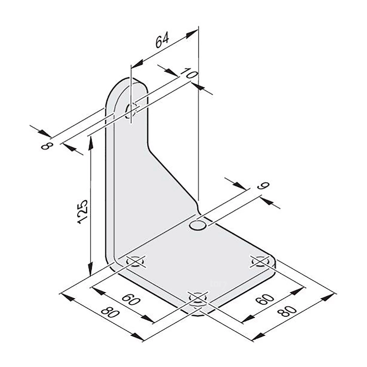 Aufgrund der 100 mm breiten Grundplatte muss für den Standardbeschlag auch der Pfeiler mindestens genauso breit sein, da sich dieser ansonsten nicht richtig verschrauben ließe. Folglich wäre dieser bei schmalen Pfeilern nur dann einbaubar, wenn zusätzlich eine Einbaukonsole zur Verbreiterung verwendet würde. Alternativ ist aber auch der SOMMER Torpfostenbeschlag 64/125 twist 200 E/EL erhältlich, der eine deutlich kleinere Grundplatte mit den Maßen 80 x 80 mm besitzt. Somit kann dieser schmalere Beschlag auch an Pfeilern angebracht werden, die nur 80 oder 90 mm breit sind. Am oberen Rand der Grundplatte ist dann die Lasche für die Antriebseinheit angebracht. Auf dieser befindet sich wiederum eine Bohrung, die eine Anbringung des Antriebs im Abstand von 125 mm zur Pfostenrückseite ermöglicht. Der seitliche Abstand dieser Bohrung zur nach innen weisenden Kante der Grundplatte beträgt 64 mm.